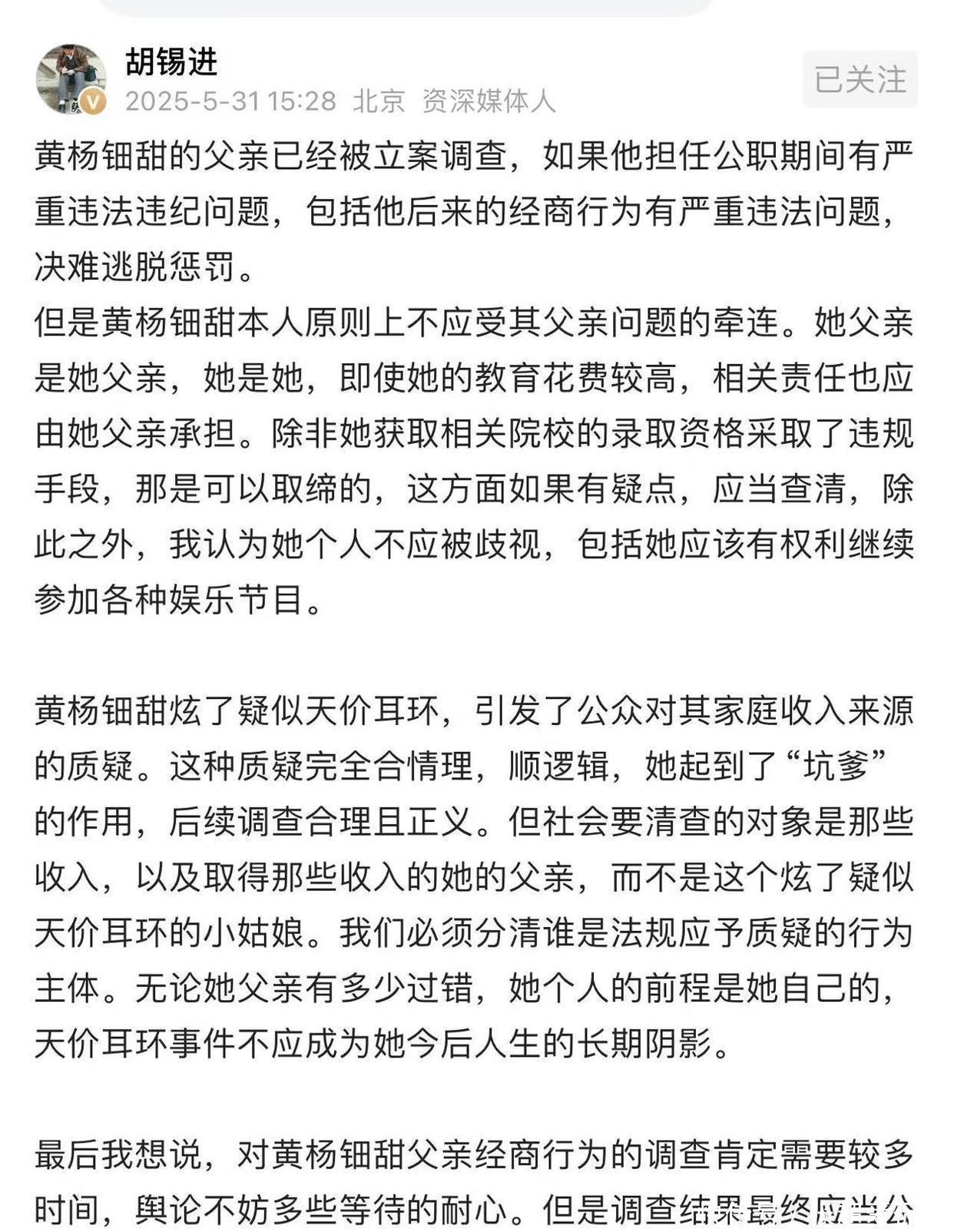 这不胡锡进可能亦然看不下去了,于是特等发文为黄杨钿甜发声了。